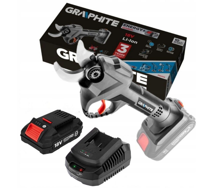 Sekator akumulatorowy GRAPHITE (nr ref. 58G029) współpracujący z akumulatorami 18V Li-Ion GRAPHITE Energy+. W konstrukcji urządzenia zastosowano nowoczesny i wydajny silnik bezszczotkowy. Maksymalna średnica cięcia wynosi 30 mm dzięki czemu możliwe jest cięcie również grubszych gałęzi. Urządzenie posiada elektryczne zabezpieczenie przeciążeniowe oraz wyłącznik bezpieczeństwa.